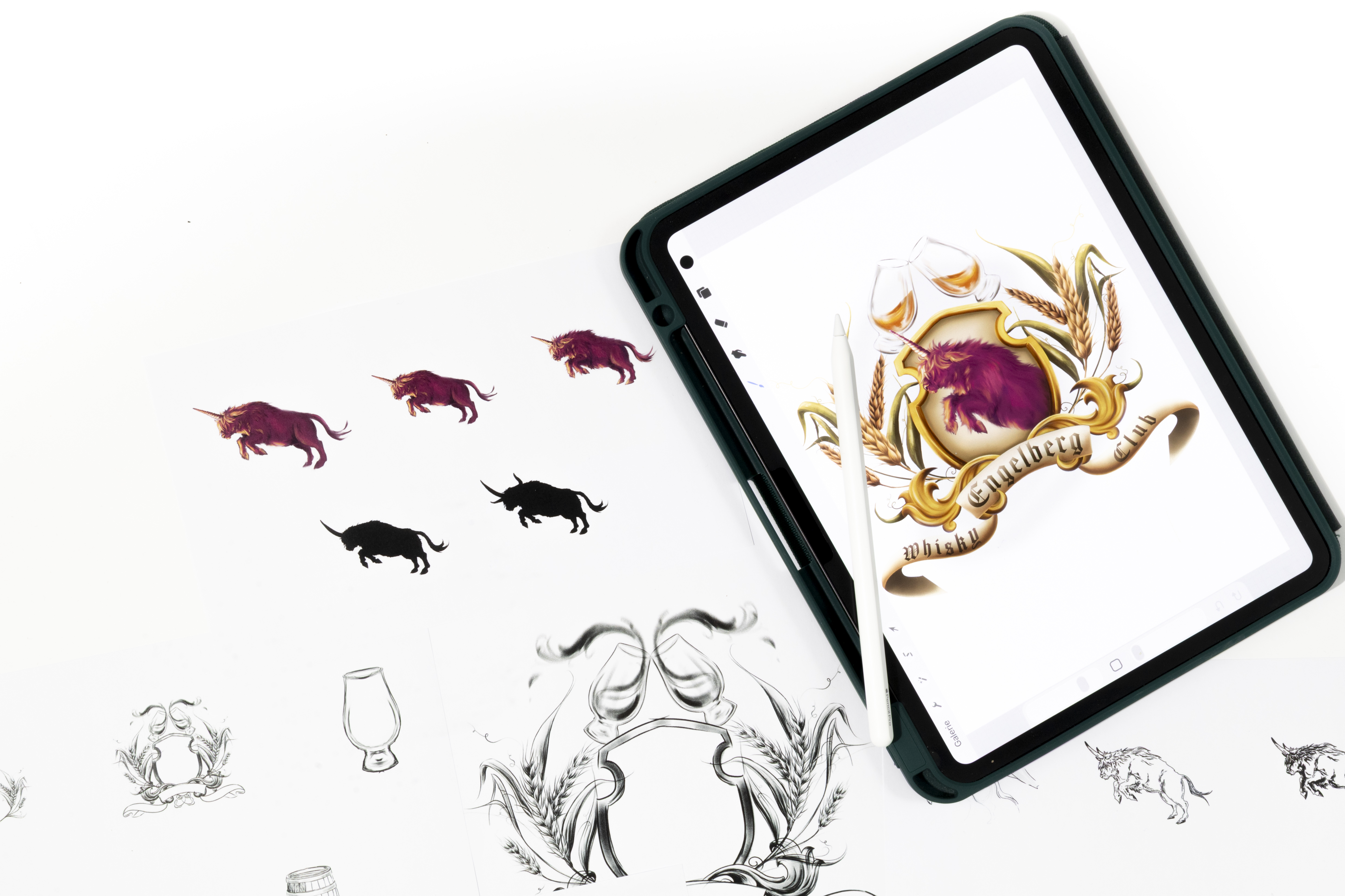 Haben Sie schon jemals ein pinkes Hochlandrind mit Einhornhorn gesehen? Was zunächst surreal und fast märchenhaft klingt, wurde in diesem Projekt zur gestalterischen Realität. Für den «Whiskey Club Engelberg» entstand ein Wappen, das eine ungewöhnliche Idee in ein visuelles Zeichen verwandelt. Aus einer spielerischen Grundidee entwickelte sich schrittweise ein charakterstarkes Emblem. Durch zahlreiche Skizzen und fortlaufende Verfeinerungen gewann das Hochlandrind zunehmend an Form und Ausdruck und erhielt eine markante, eigenständige Präsenz. Das Thema Whiskey bildet den inhaltlichen Kern der Gestaltung. Stilisierte Whiskeygläser und aufragende Gerstenhalme verankern das Motiv klar im Kontext und verleihen dem Wappen seine Identität. So verbindet das Ergebnis Fantasie, traditionelle Symbolik und gestalterische Präzision zu einem unverwechselbaren Emblem.
