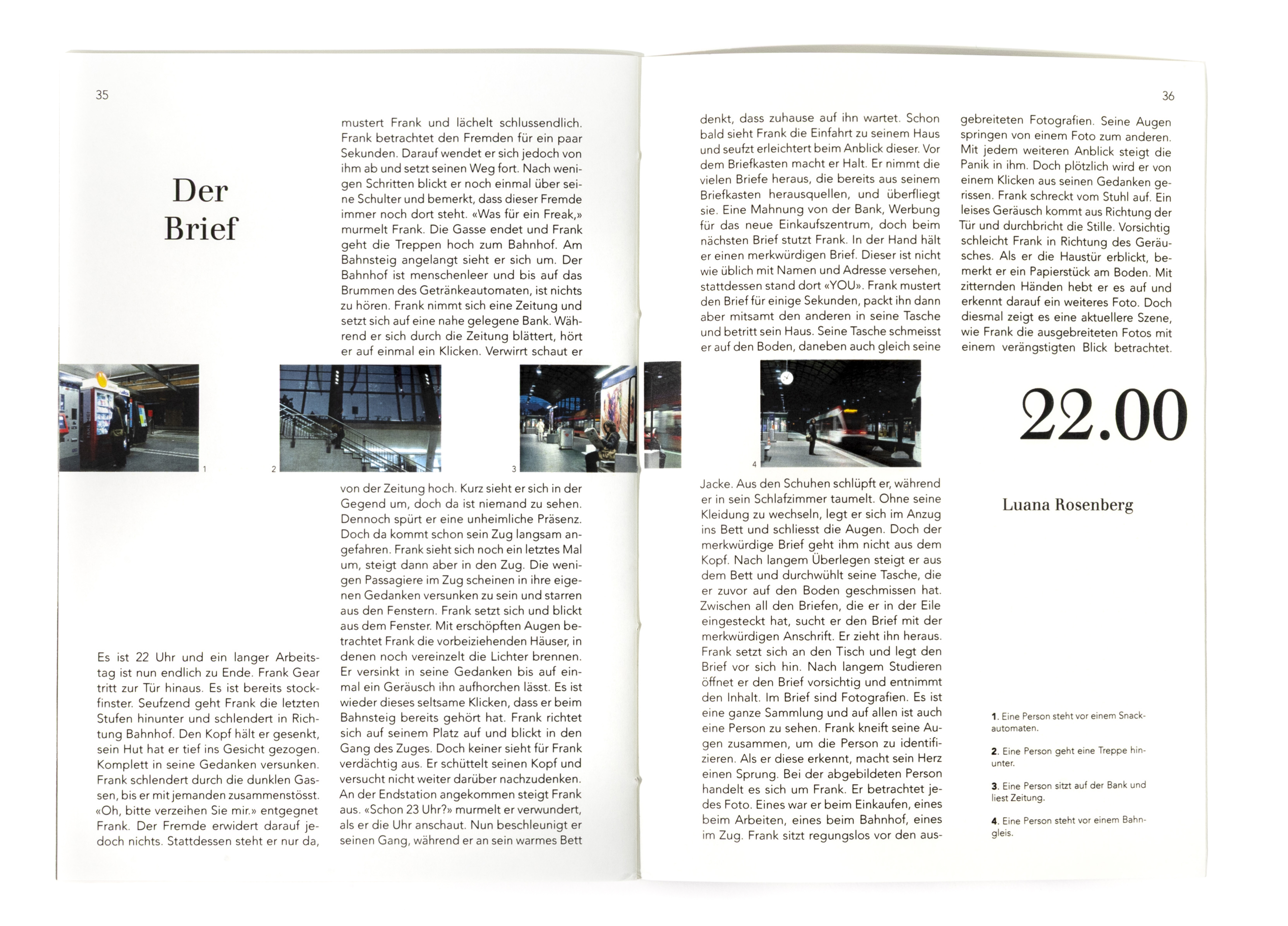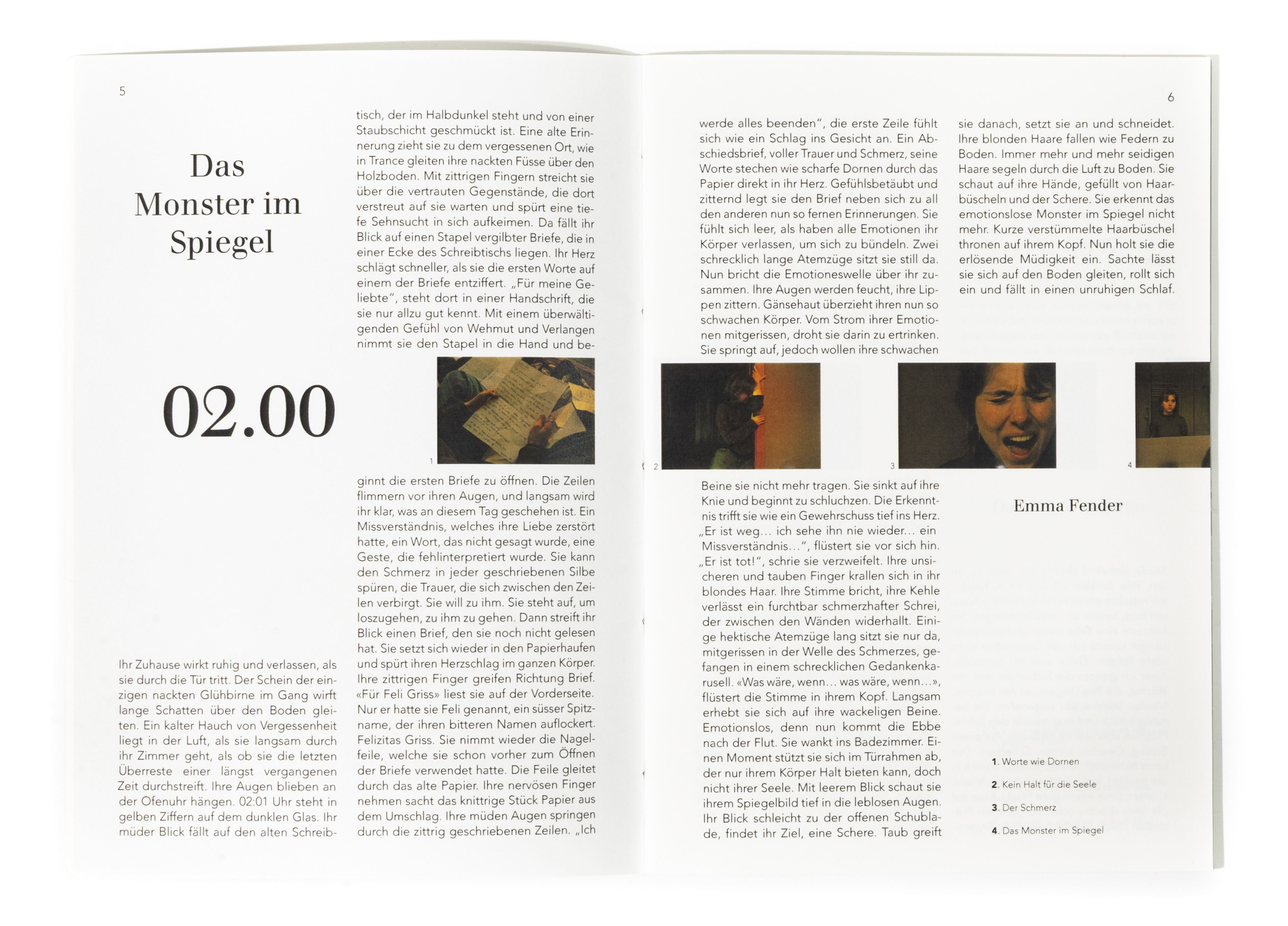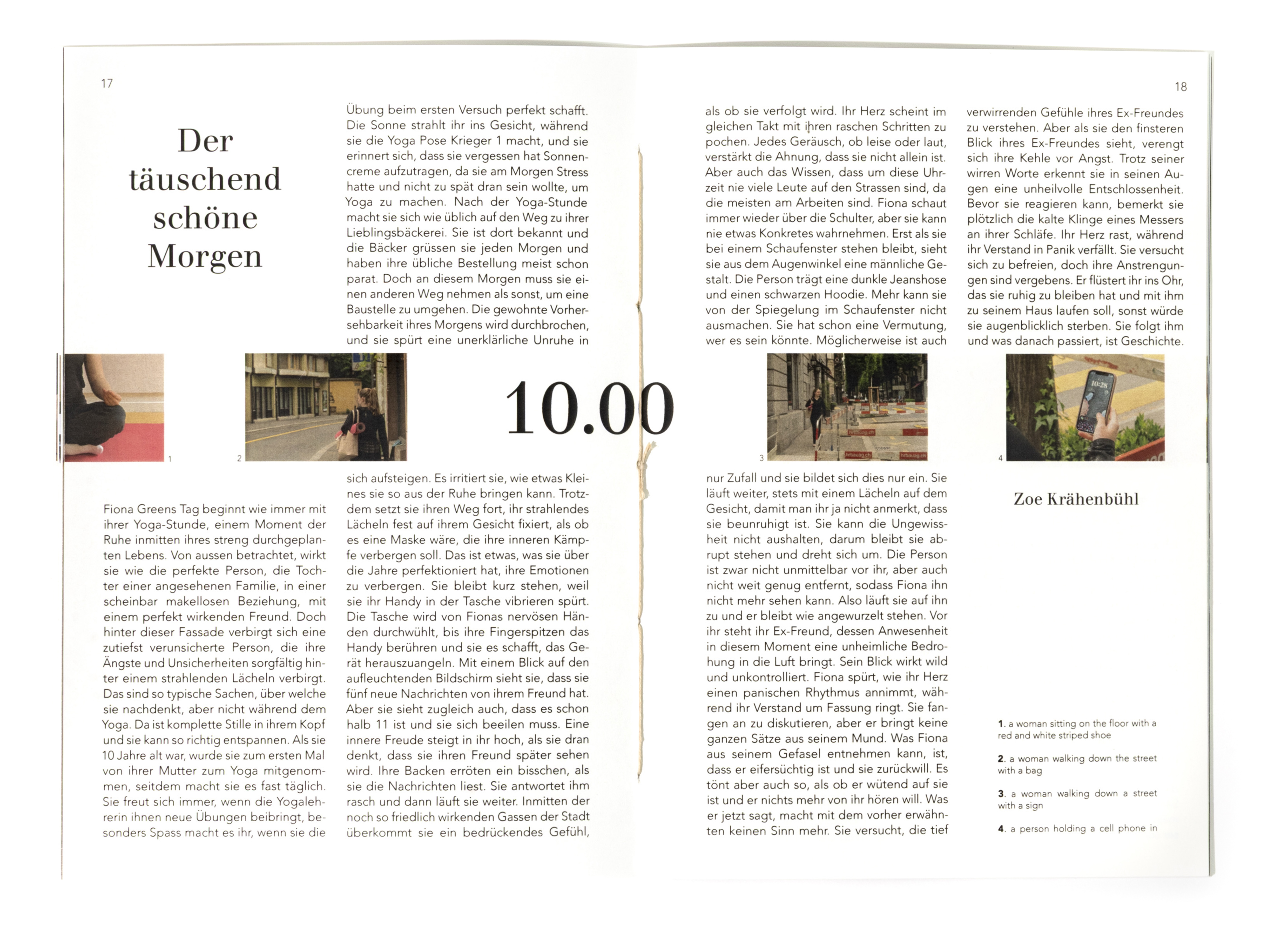 In diesem Projekt stand die Auseinandersetzung mit dem Thema Zeit im Zentrum. Ausgehend von der Überlegung, dass Zeit unaufhaltsam voranschreitet und sich gleichzeitig in Zyklen wiederholt, entstand ein Buch, das diesen Rhythmus visuell übersetzt. Innerhalb eines 24-Stunden-Ablaufs bewegt sich der Inhalt im Zweistundentakt voran. Die Gestaltung folgt einer kontinuierlichen Bewegung; die Positionen verschieben sich von Seite zu Seite, wodurch ein fliessender Übergang zwischen den einzelnen Zeitpunkten entsteht. Die Bildabfolge bleibt nicht statisch, sondern scheint mitzuwandern, als würde sie dem Verauf der Zeit folgen. Keine Seite gleicht der anderen, und der Ablauf bleibt trotz seiner Struktur dynamisch und organisch. Ziel war es, die Zeit im Medium der Bilder erlebbar zu machen. Durch eine gleichmässige, konstante Veränderung wird der Tagesablauf nicht nur dargestellt, sondern räumlich und visuell spürbar. Jede Geschichte bewegt sich innerhalb ihres eigenen Zeitfensters und entwickelt dabei einen individuellen Bildrhythmus, der ihren Charakter bestimmt.
