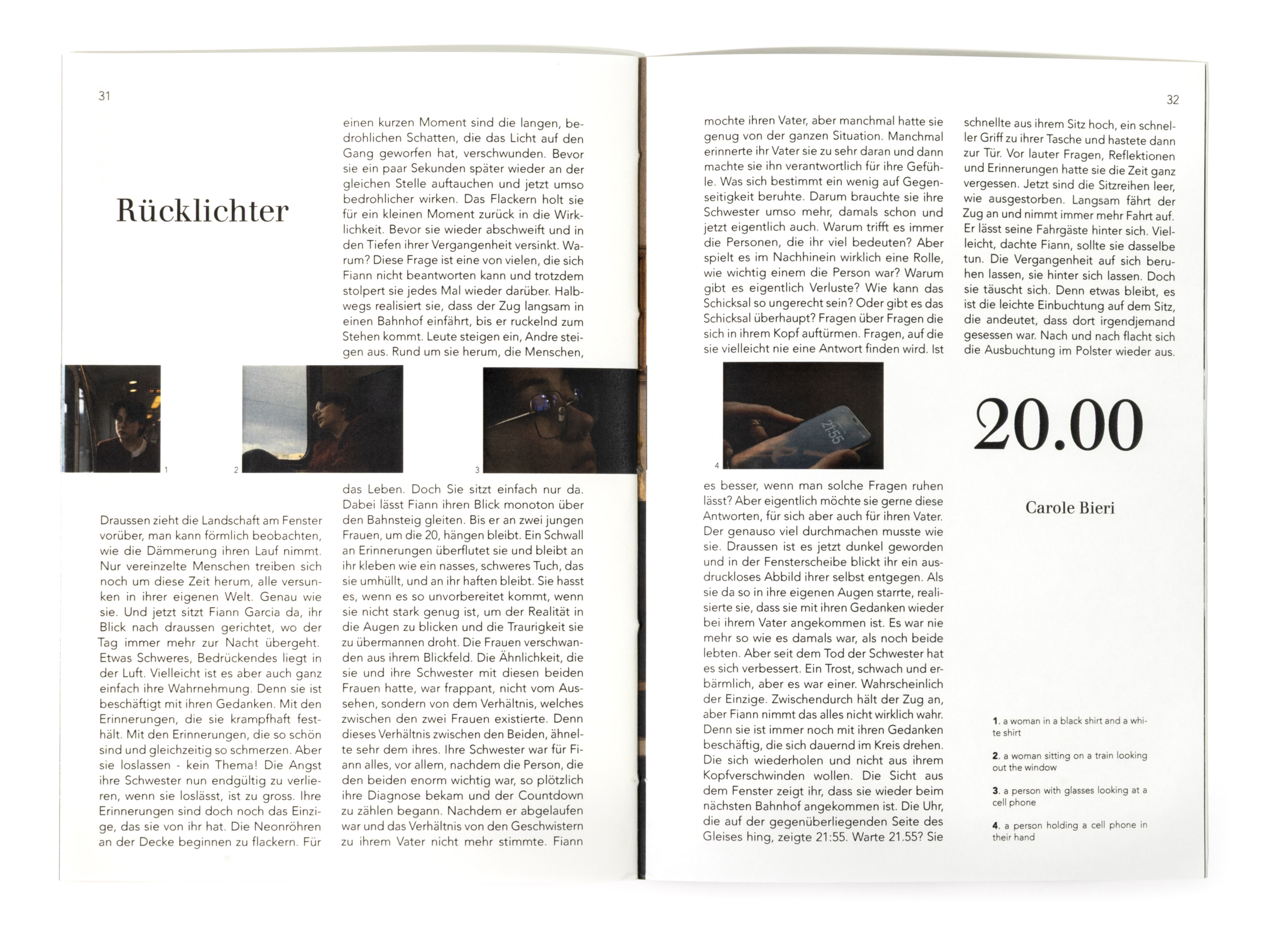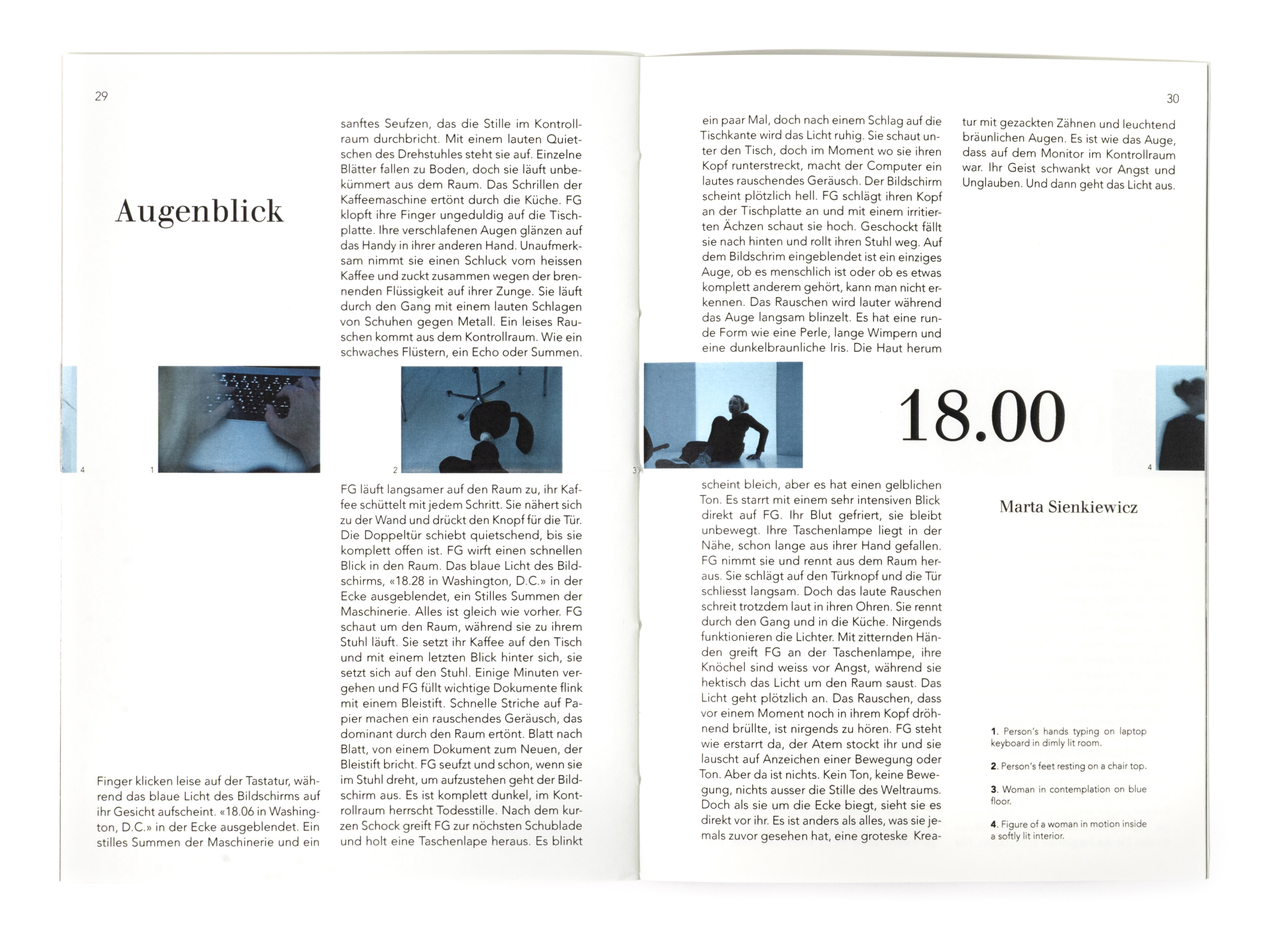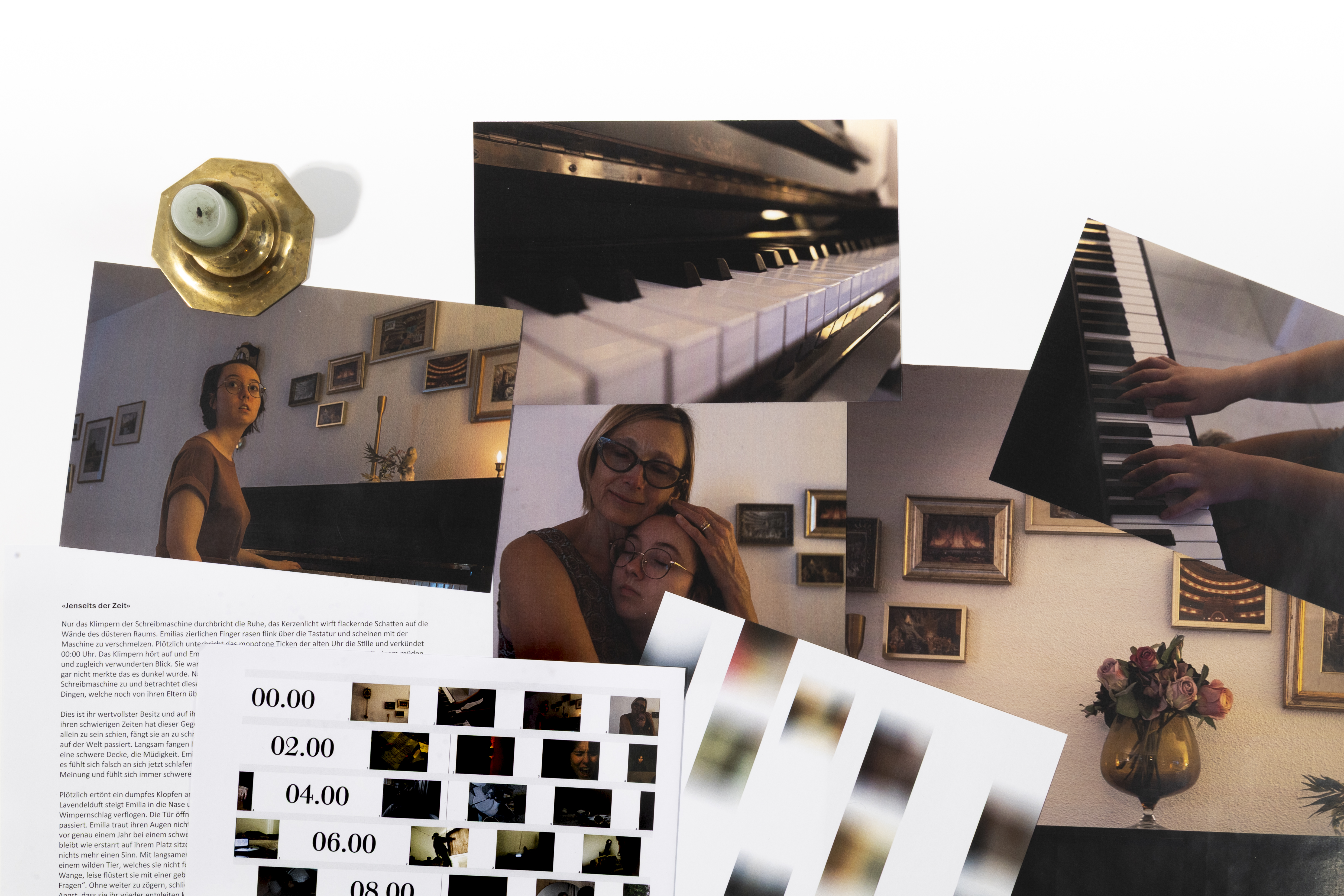 In diesem Projekt stand die Auseinandersetzung mit dem Thema Zeit im Zentrum. Ausgehend von der Überlegung, dass Zeit unaufhaltsam voranschreitet und sich gleichzeitig in Zyklen wiederholt, entstand ein Buch, das diesen Rhythmus visuell übersetzt. Innerhalb eines 24-Stunden-Ablaufs bewegt sich der Inhalt im Zweistundentakt voran. Die Gestaltung folgt einer kontinuierlichen Bewegung; die Positionen verschieben sich von Seite zu Seite, wodurch ein fliessender Übergang zwischen den einzelnen Zeitpunkten entsteht. Die Bildabfolge bleibt nicht statisch, sondern scheint mitzuwandern, als würde sie dem Verauf der Zeit folgen. Keine Seite gleicht der anderen, und der Ablauf bleibt trotz seiner Struktur dynamisch und organisch. Ziel war es, die Zeit im Medium der Bilder erlebbar zu machen. Durch eine gleichmässige, konstante Veränderung wird der Tagesablauf nicht nur dargestellt, sondern räumlich und visuell spürbar. Jede Geschichte bewegt sich innerhalb ihres eigenen Zeitfensters und entwickelt dabei einen individuellen Bildrhythmus, der ihren Charakter bestimmt.