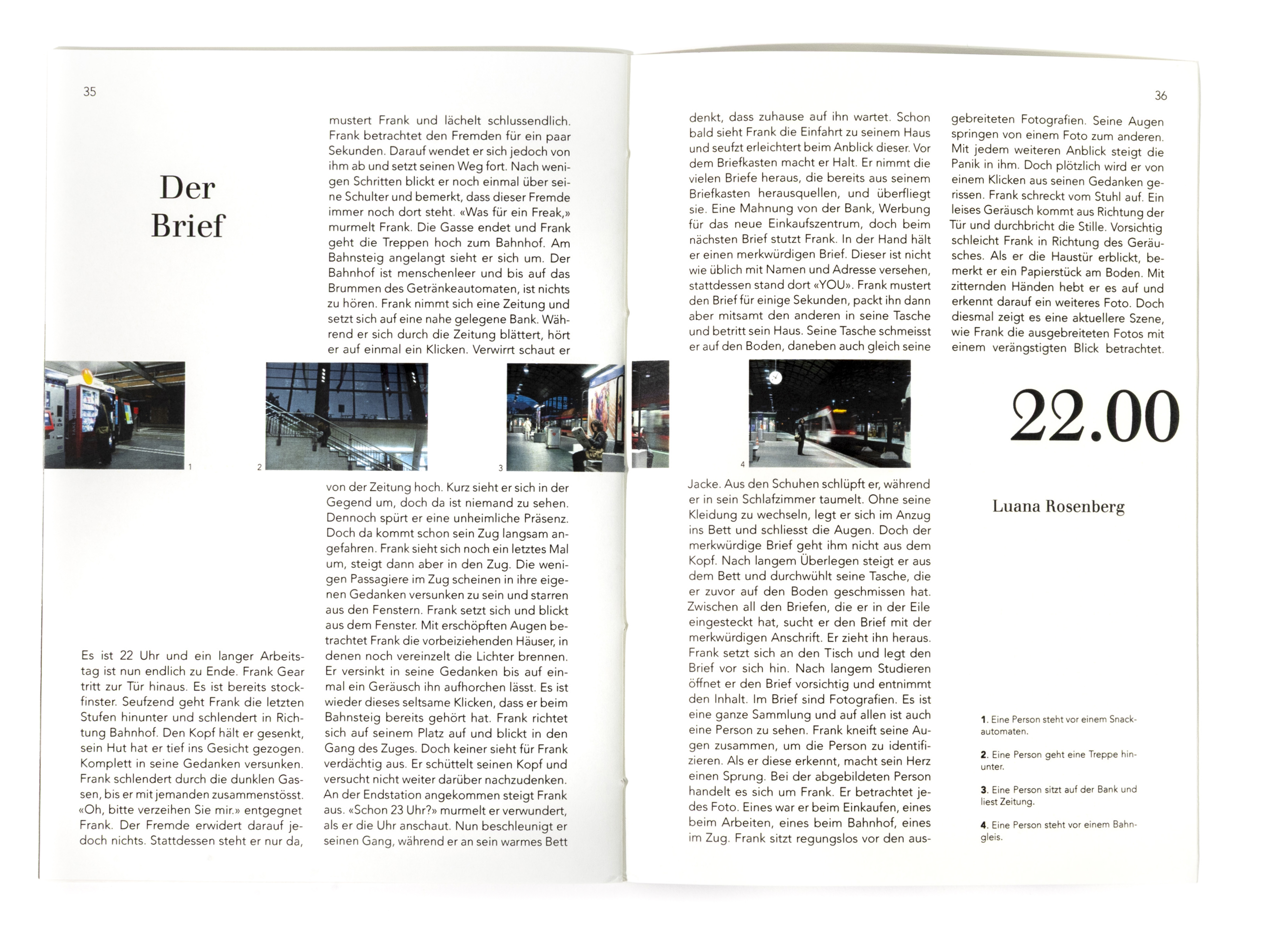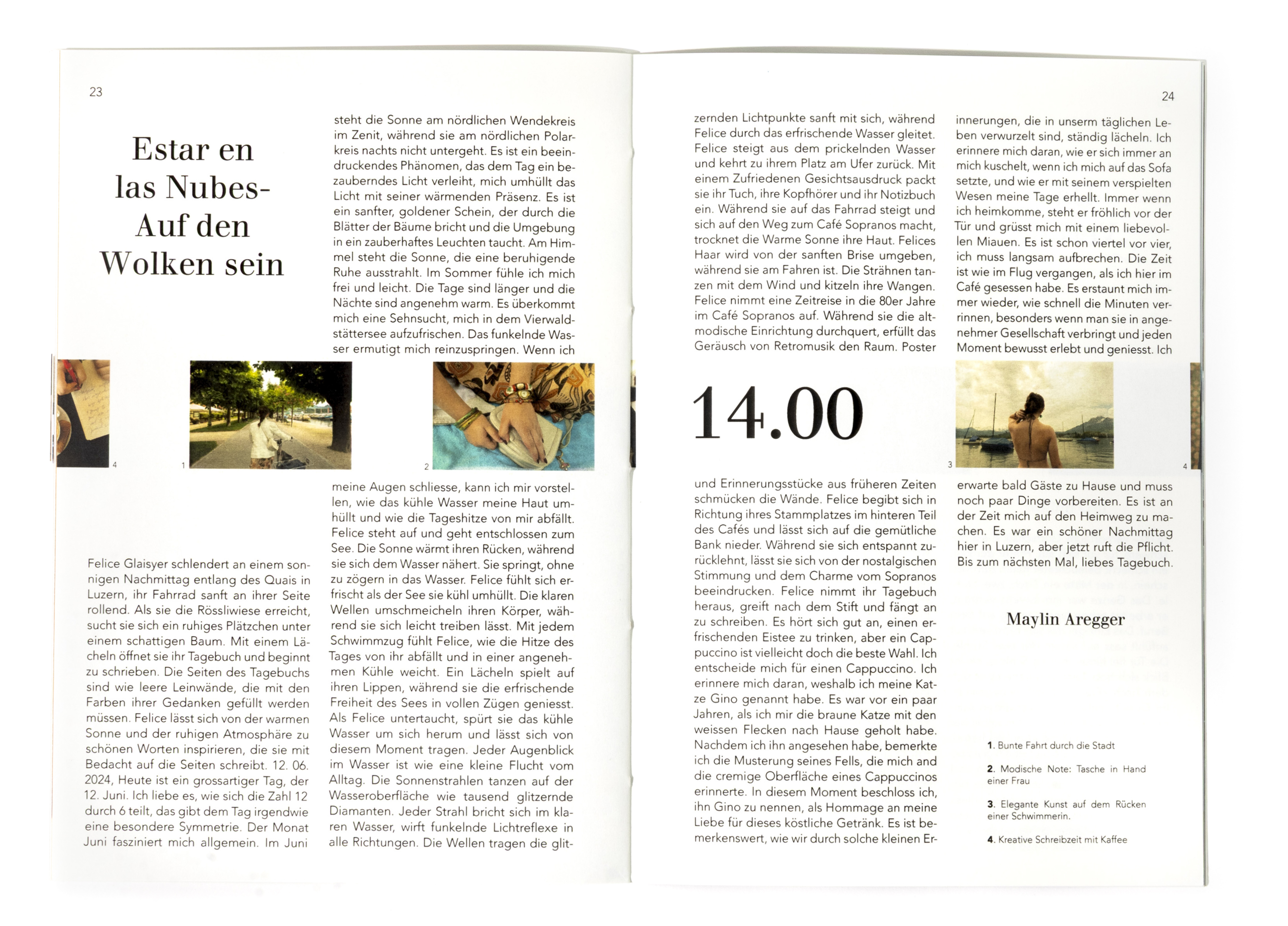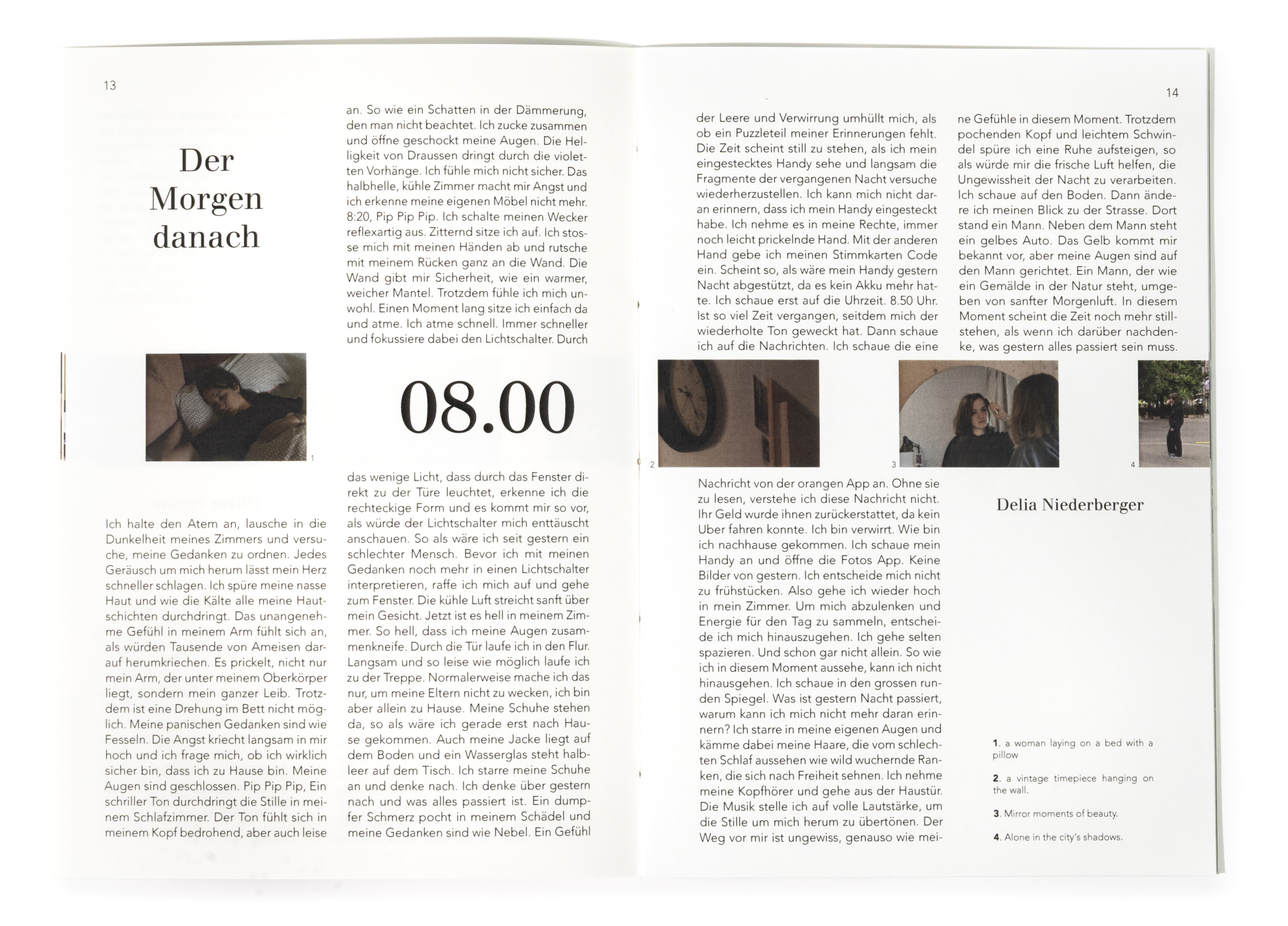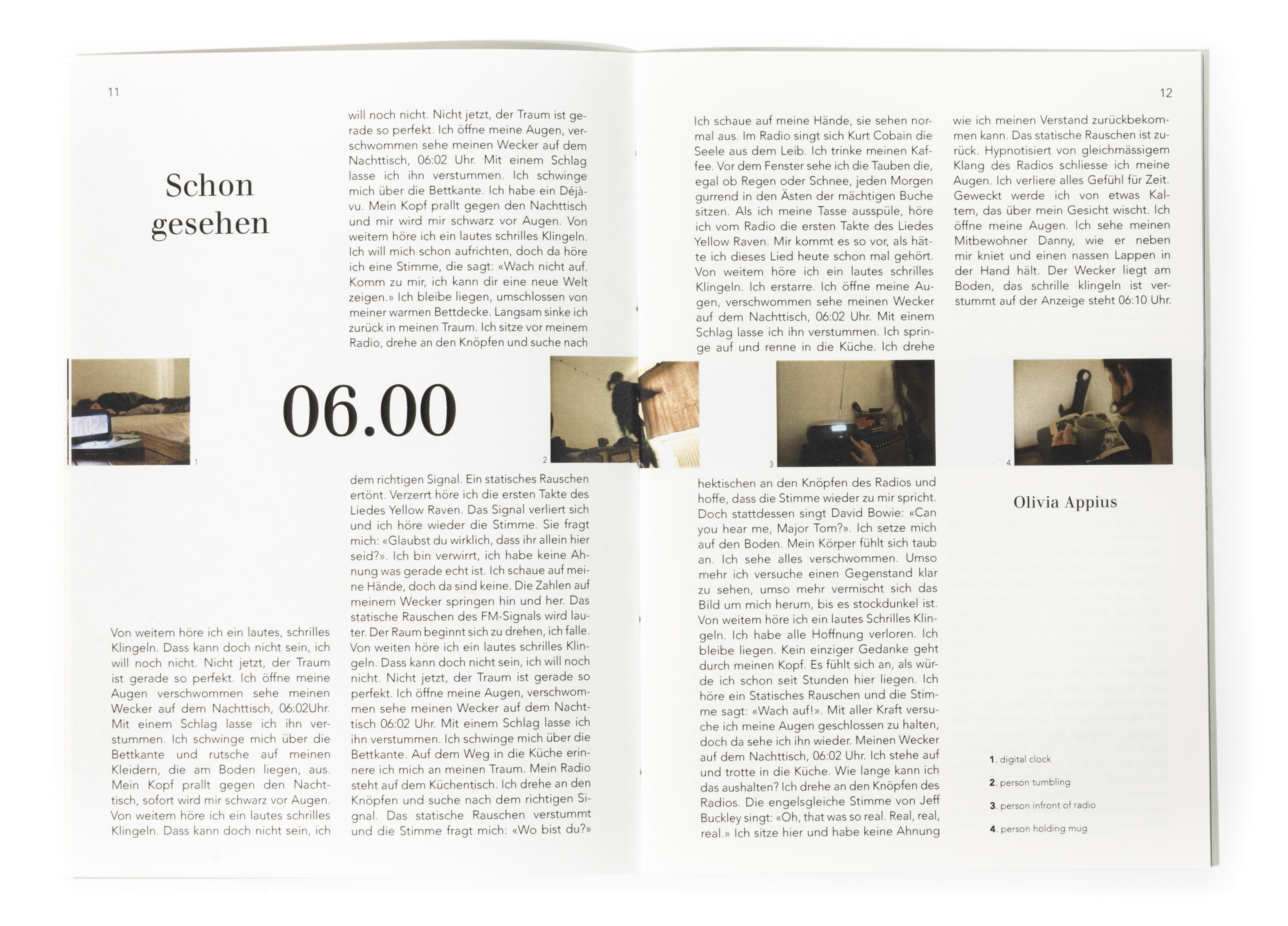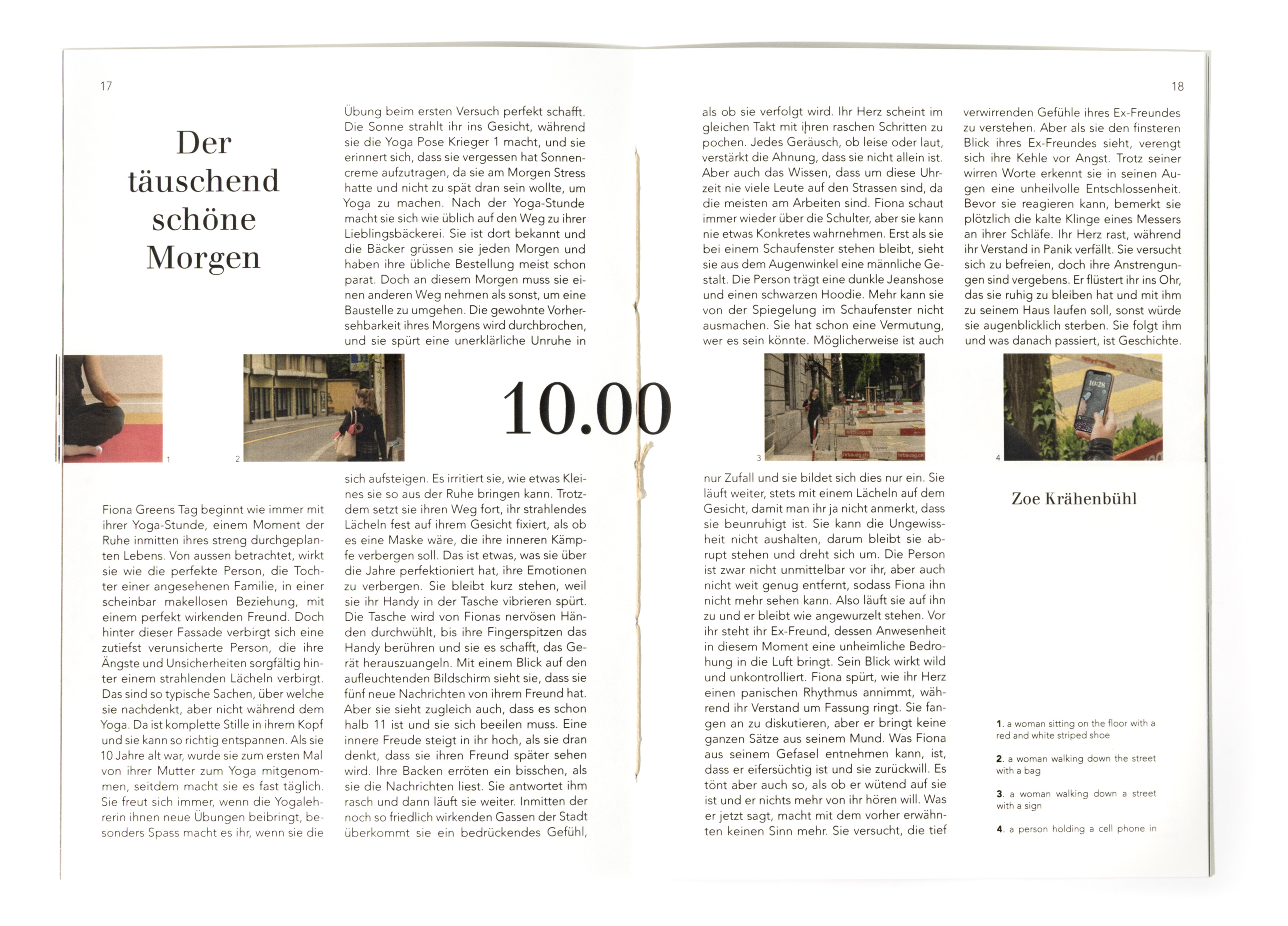 In diesem Projekt stand die Auseinandersetzung mit dem Thema Zeit im Zentrum. Ausgehend von der Überlegung, dass Zeit unaufhaltsam voranschreitet und sich gleichzeitig in Zyklen wiederholt, entstand ein Buch, das diesen Rhythmus visuell übersetzt. Innerhalb eines 24-Stunden-Ablaufs bewegt sich der Inhalt im Zweistundentakt voran. Die Gestaltung folgt einer kontinuierlichen Bewegung. Die Positionen verschieben sich von Seite zu Seite, wodurch ein fliessender Übergang zwischen den einzelnen Zeitpunkten entsteht. Die Bildabfolge bleibt nicht statisch, sondern scheint mitzuwandern, als würde sie dem Verauf der Zeit folgen. Keine Seite gleicht der anderen, und der Ablauf bleibt trotz seiner Struktur dynamisch und organisch. Ziel war es, die Zeit im Medium der Bilder erlebbar zu machen. Durch eine gleichmässige, konstante Veränderung wird der Tagesablauf nicht nur dargestellt, sondern räumlich und visuell spürbar. Jede Geschichte bewegt sich innerhalb ihres eigenen Zeitfensters und entwickelt dabei einen individuellen Bildrhythmus, der ihren Charakter bestimmt.