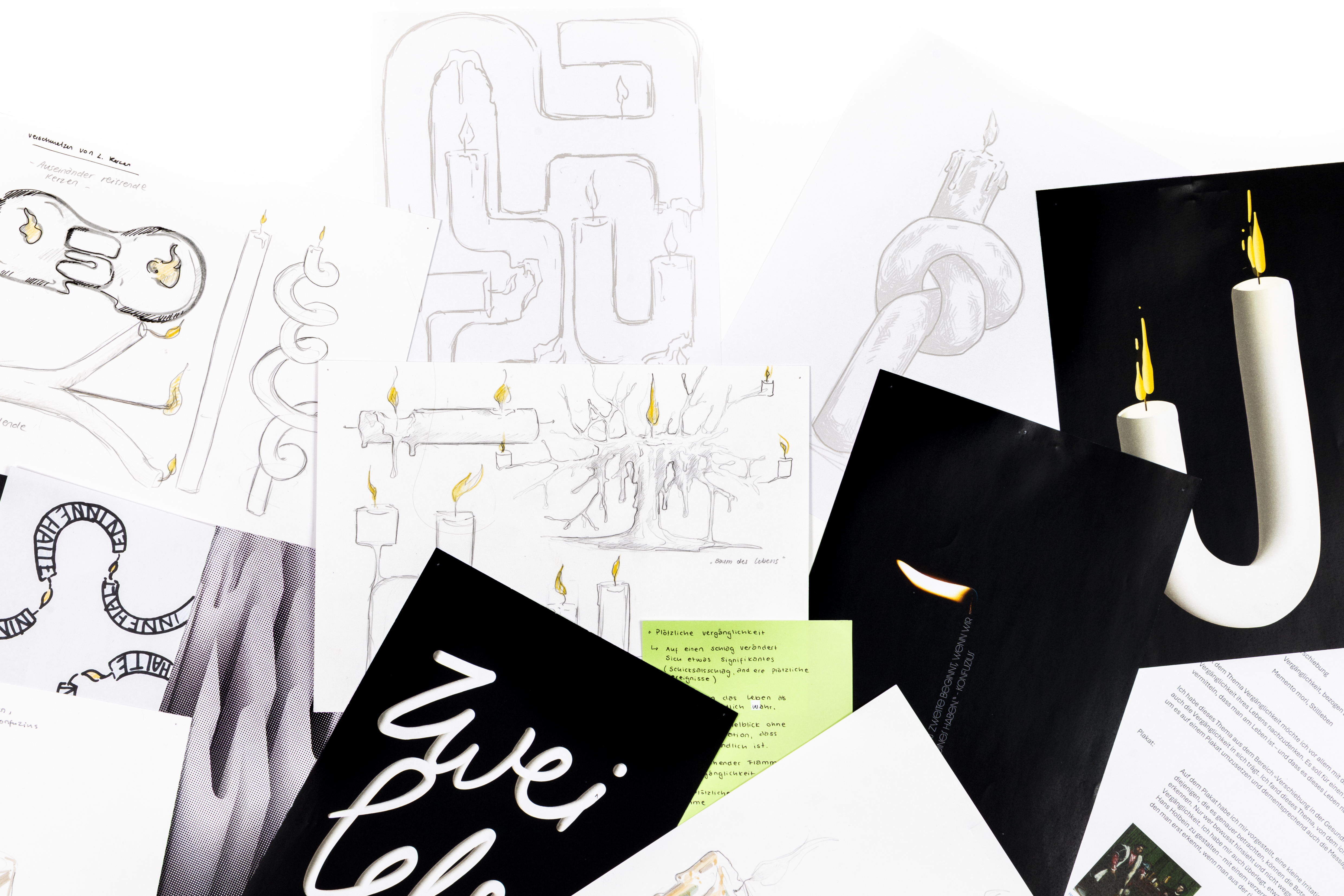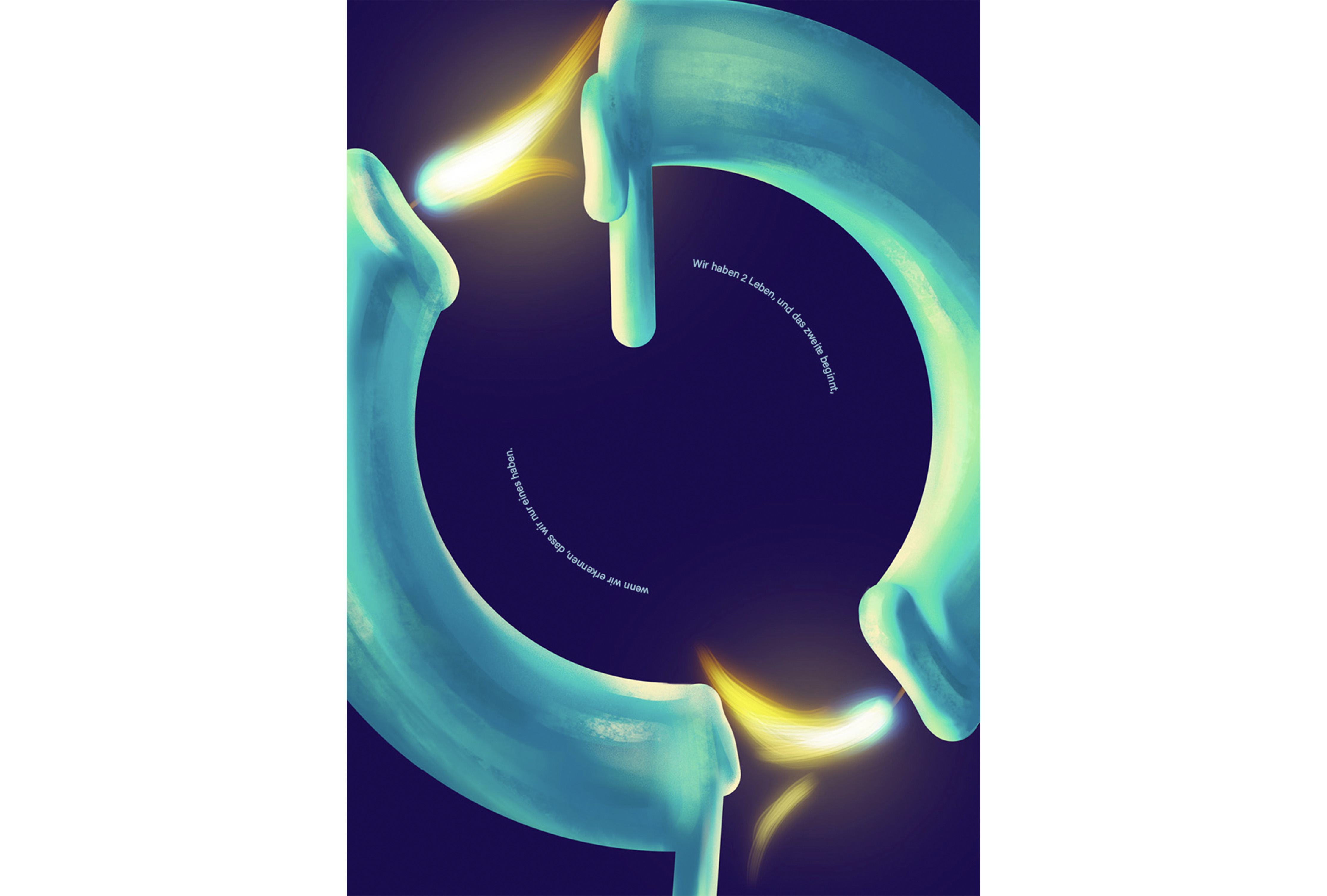Wie einst Konfuzius formulierte: «Wir haben zwei Leben, und das zweite beginnt, wenn wir erkennen, dass wir nur eines haben.» Dieser Gedanke bildet den Ausgangspunkt des Projekts und dient als zentrales Motiv. Er lädt zum Innehalten ein und führt unmittelbar zur Auseinandersetzung mit dem Thema Vergänglichkeit. Ausgangspunkt war ein fotografisches Motiv: eine Kerze kurz vor dem Erlöschen – ein Sinnbild für das Ende eines Moments und gleichzeitig die Endlichkeit des Lebens. Dieses Symbol wurde weitergedacht und für die Plakatgestaltung transformiert mit dem Ziel, Vergänglichkeit visuell erfahrbar zu machen und beim Betrachtenden einen Moment der Reflexion auszulösen. Im Prozess wurde insbesondere im illustrativen Bereich experimentiert. In Procreate entstand die Darstellung zweier Kerzen, die sich plastisch aus dem Raum herausentwickeln und den Eindruck einer greifbaren, dreidimensionalen Form erzeugt. Die Typografie wurde diagonal über das Format gesetzt, um Spannung aufzubauen So entsteht ein Zusammenspiel zwischen Bild und Schrift, welches das Thema zugleich reduziert, verdichtet und emotional zugänglich macht.